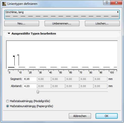Verwenden Sie das Dialogfenster Linientypen, wenn Sie die Standard-Linientypen (durchgezogen, gepunktet, gestrichelt etc.) ändern oder individuelle Linientypen definieren wollen.