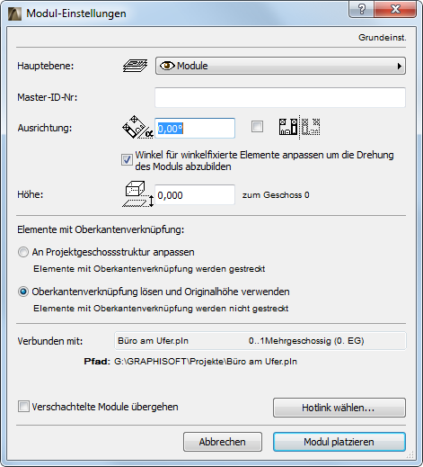 •Höhen-/Erhebungswerte: Die Positionierung wird relativ zum Geschoss der Quelldatei durchgeführt. Sie können im Eingabefeld für die Höhe einen Wert eingeben, der bei der Platzierung des Moduls als Versatzwert relativ zur ursprünglichen Geschosshöhe interpretiert wird.
