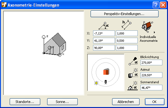 Verwenden Sie die Bedienelemente in diesem Dialogfenster zum Einstellen der 3D-Ansichten als Axonometrie-Einstellungen.