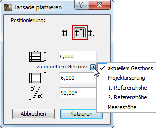 Dieses Dialogfenster erscheint nur als Teil des Eingabeprozesses. Verwenden Sie zum späteren Ändern der Höhe einer platzierten Fassade die grafischen Bearbeitungsmethoden im Fassaden-Bearbeitungsmodus.