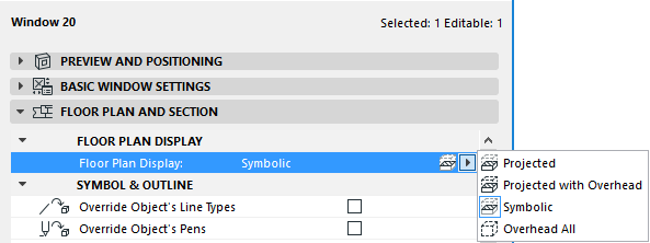 Note: Define Overhead attributes (line type, pen) in the Floor Plan and Section panel of Door/Window Settings.