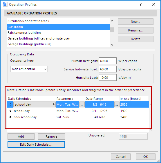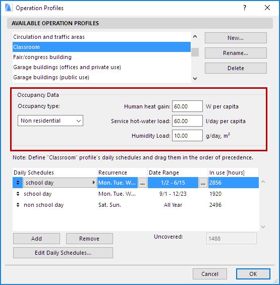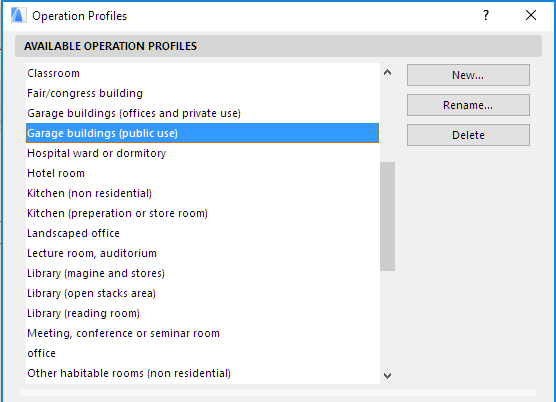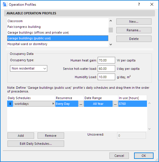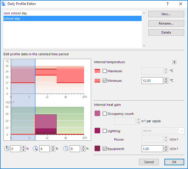 It is also possible to rename or to create custom Operation Profiles with the Energy Evaluation function within ARCHICAD, and to add them to the list of Available Operation Profiles. You can also edit them as needed, by changing the values in the daily schedule list item they reference.