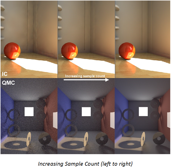 Sample Count: This setting defines the fixed number of samples to be used. A higher value produces a correspondingly better render quality (for QMC this can be seen in the graininess; for IR the number of spots is reduced).