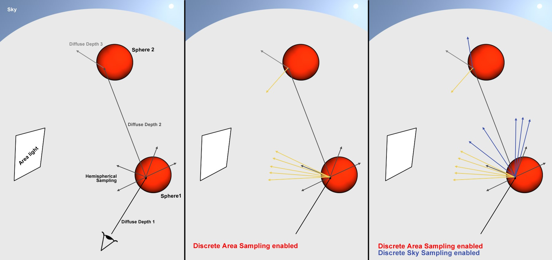 •Right (Discrete Area Sampling and Discrete Sky Sampling enabled): In addition to the hemispherical sampling and the Area light sampling, additional samples are sent out in the direction of the sky.