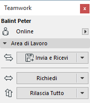 In Teamwork, la disponibilità dei comandi di questa palette varia anche in base al fatto di trovarsi online o offline, e se si dispone dei diritti di Amministratore di server o di progetto oppure no.