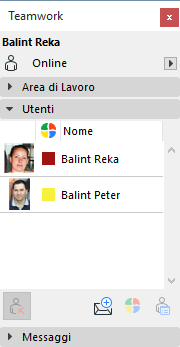 Questo pannello elenca gli utenti correntemente uniti al progetto. Se l'utente si trova correntemente offline, l'icona "persona" alla sinistra del nome è visualizzata in grigio. Il colore che accompagna ciascun nome utente può essere usato per identificare i suoi elementi sullo schermo.