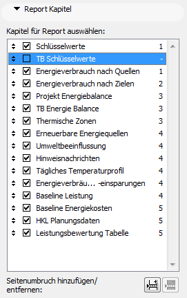 Nach Abschluss der dynamischen Energiesimulation wird das Dialogfenster Bewertungsbericht angezeigt. Passen Sie mit den Steuerungen auf der linken Seite bestimmte Aspekte des Inhalts des Energieeffizienz-Bewertungsberichts an, bevor Sie diesen speichern.