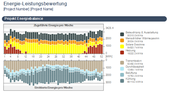 •Einstellungen Kapitel Projekt Energiebalance: Wählen Sie Wöchentlich oder Monatlich für das Zeitintervall aus, und geben Sie die Energieeinheit (kWh, kBtu, MJ) an. Sie können auch die Farben des Balkendiagramms anpassen.