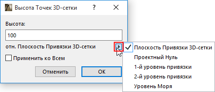 Стрелка под окошком редактирования открывает всплывающее меню, в котором Вы выбираете уровень привязки, относительно которого указывается высота вершины.