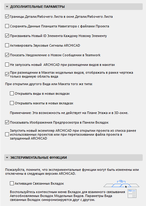 Здесь могут отображаться некоторые “экспериментальные” функции, доступные для использования. В зависимости от мнения пользователей, они могут быть включены или не включены в последующие версии ARCHICAD.