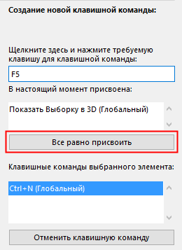 Для присвоения клавишной команды несмотря на обнаруженный конфликт, нажмите кнопку Все равно присвоить. В этом случае происходит назначение клавиши выбранной команде/функции с одновременным удалением ее связи с предыдущей командой/функцией.