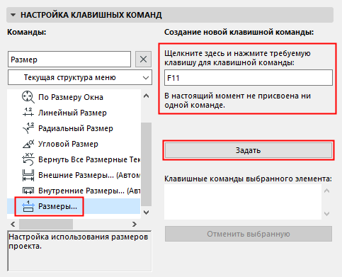 Если для выбранной команды/функции уже назначена клавишная команда, то она отображается в поле Клавишные команды выбранного элемента, присутствующем справа.