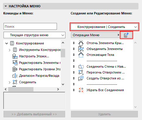 •Кнопки Добавить выбранный и Удалить служат для настройки содержимого меню.
