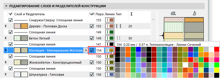 В этой панели приводятся компоненты (слои, линии контуров и линии разделения слоев) выбранной многослойной конструкции. Расположенное справа окно Предпросмотра предназначено для графического представления (совмещающего сечения и покрытия) конструкции.