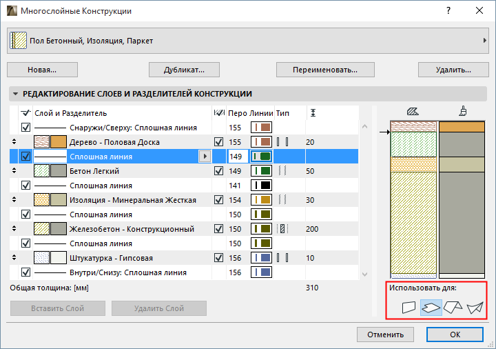 •Данная Многослойная Конструкция будет доступна для выбора в диалоговых окнах только указанных элементов (Стен, Перекрытий, Крыш и/или Оболочек). Например, в Параметрах Перекрытия: