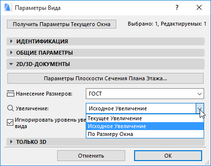 Игнорировать уровень увеличения и поворот при открытии этого вида: Если маркер этот активирован, то при каждом открытии вид будет открываться в соответствии с настройками последнего открытого окна ARCHICAD (сохраненные параметры увеличения и поворота данного вида будут игнорироваться). Однако сохраненное увеличение вида по-прежнему будет учитываться при размещении вида на Макетах и при Публикации.