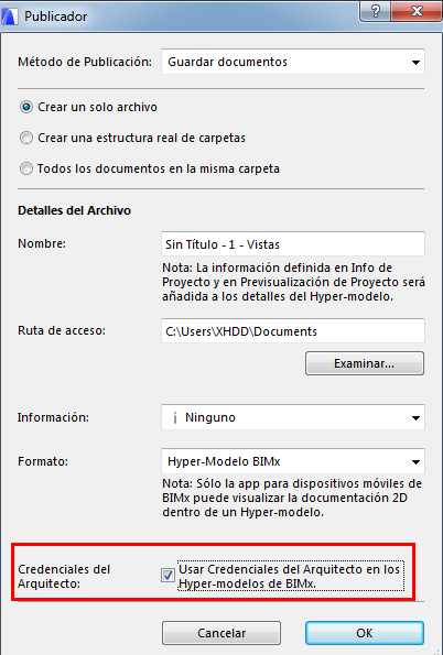 En las Propiedades del Grupo de Publicación: Cuando defina las opciones para Guardar o Subir el Hyper-modelo BIMx, active la casilla de Credenciales del Arquitecto.