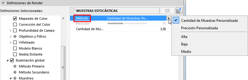 Utilice estos campos para definir una cantidad de muestras personalizado. Si Cantidad Personalizada está desactivada, se utilizará el mismo número de muestras como se define en el Muestreo Estocástico.
