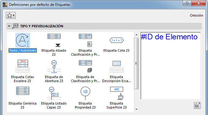 El panel Tipo y Previsualización define las opciones de etiquetado de los elementos, y muestra una previsualización.