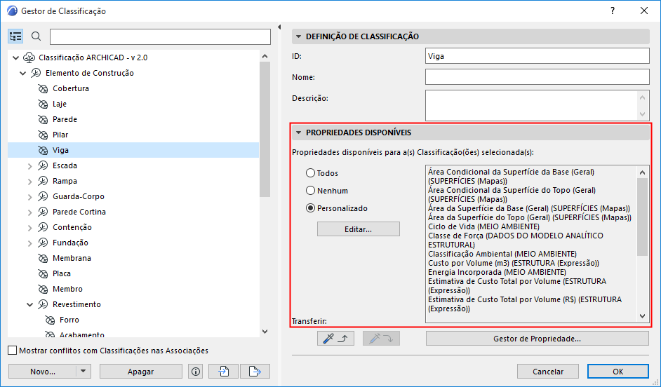 •Para personalizar o conjunto de propriedades disponíveis para cada Classificação