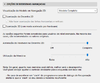 Se definir a Aceleração do Hardware para um nível que, em determinadas situações, exceda o desempenho da placa gráfica, o ARCHICAD poderá recuar automaticamente para um Nível de Aceleração do Hardware abaixo daquele que definiu. O slider não será deslocado pelo ARCHICAD, mas será emitido um aviso sobre este fato no fundo da caixa de diálogo: