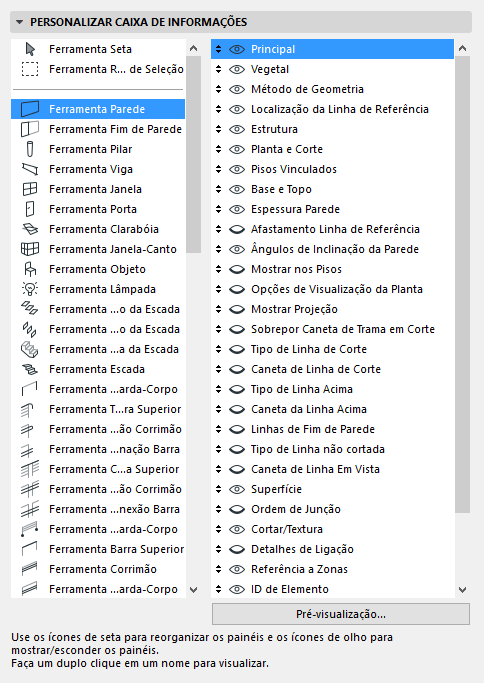 A janela da esquerda contém uma lista de todas as ferramentas do ARCHICAD. A janela da direita apresenta os painéis que aparecem na Caixa de Informações da ferramenta selecionada.