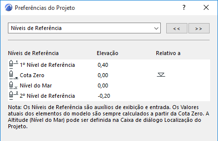 Pode ser mais simples calcular níveis (nesta caixa de diálogo), atribuindo o valor zero a outro nível que não a Origem do Projeto. Pode fazê-lo, clicando no campo Relativo a junto ao nome do nível.
