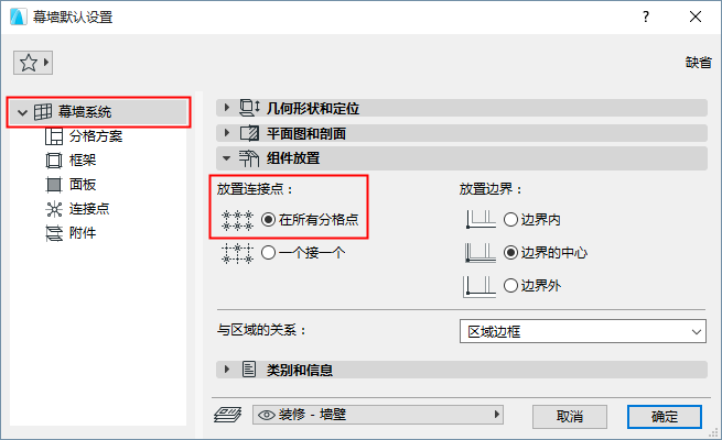 为将它们放置在所有栅格点上,请选择位于幕墙系统设置中的组件放置下的选项。