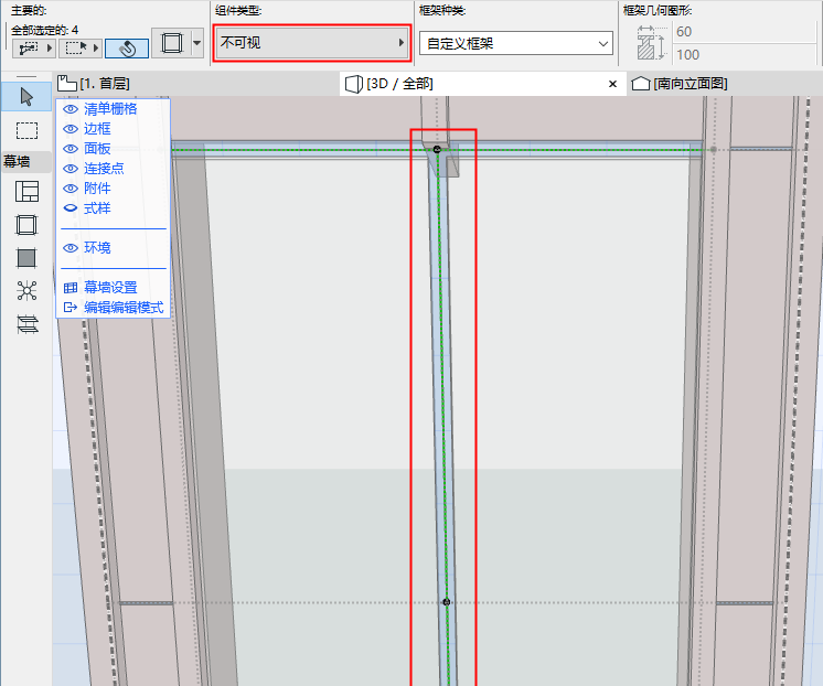 在默认情况下,连接点放在幕墙的内侧。将连接点翻转到幕墙对边(使用连接点工具设置或信息框中的翻转按钮)。
