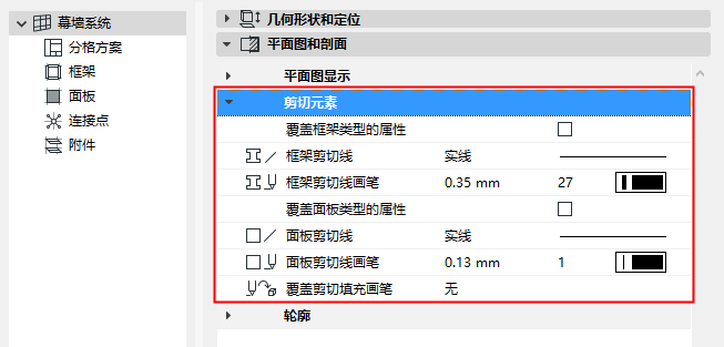 使用这些控制项,定义幕墙的外观:平面图显示;剪切元素(剪切框架及剪切面板的外观);及其轮廓。