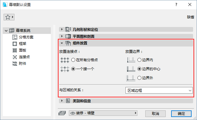 注意:幕墙栅格式样是在对话框的方案页面内定义的。