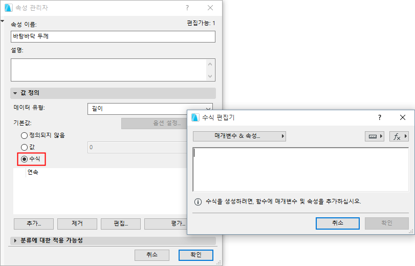 3.값 정의 패널에서, 수식을 활성화합니다. 수식 편집기 대화상자가 나타납니다.