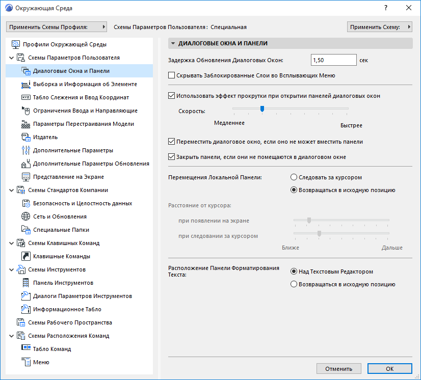 Настройки Окружающей Среды состоят из шести Схем; сохранение параметров происходит на уровне Схемы. Схемы Окружающей Среды сохраняются в локальной папке на вашем компьютере (не в файле проекта). Вы можете сохранять, импортировать и экспортировать все или отдельные файлы схем.