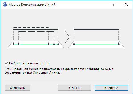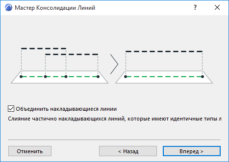 Для открытия этого диалогового окна следует предварительно выбрать, по крайней мере, две штриховки. Выполните команду Редактор > Изменить форму > Консолидация линий.