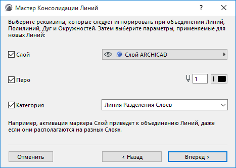 Для каждого из отмеченных реквизитов активизируются соответствующие управляющие элементы слоя/пера/категории, с помощью которых Вы можете указать, какой именно слой/перо/категорию следует присвоить линии, получающейся в результате объединения.