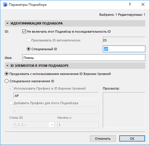 Используйте управляющие элементы этой панели для присвоения ID выбранному поднабору.