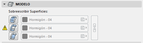 Si aplica un material aquí en cualquier borde que sea distinto a la superficie de borde definida en el panel Modelo de las Definiciones de Estructura Compleja (o Material de Construcción), el panel Modelo indicará (con un marcador amarillo) que se ha aplicado la superficie de borde personalizada.