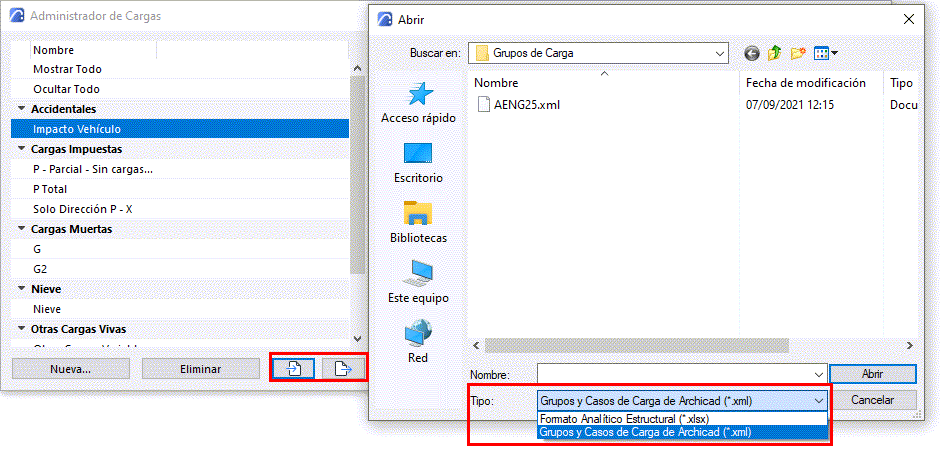 En el Administrador de Cargas, use los botones de Importar y Exportar para transferir datos de Grupos y Casos de Carga.
