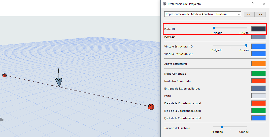 El espesor de la Parte 1D se define en: Preferencias del Proyecto > Modelo Analítico Estructural Representación