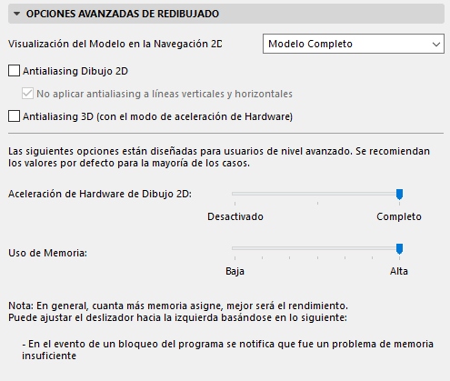 Completo: Modo completo hardware. Independientemente del número de monitores, todos los procesos de Dibujo 2D, incluido el antialias, se realizan a través de la tarjeta de vídeo. Sin embargo, el rendimiento de ciertas tarjetas de vídeo antiguas (en lo que se refiere a velocidad y memoria) puede no ser suficiente: el proceso de redibujado debe repetirse en cada monitor, lo que requiere una gran cantidad de memoria de vídeo.