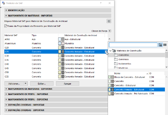 Nota: Se você mapear as seções transversais do SAF recebidas para o Perfil do Archicad pelo nome (Mapeamento de Perfil - painel de importação), então você não precisa mapear seus materiais porque o Perfil do Archicad inclui um Material de Construção.