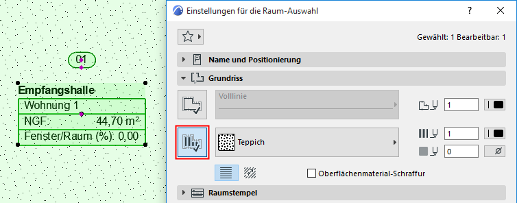 Wenn Sie eine Raumflächenschraffur zugeordnet haben, wird diese standardmäßig im Grundriss angezeigt.
