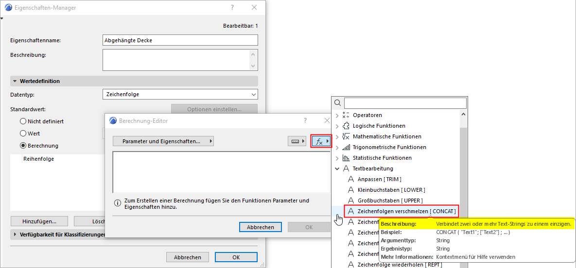 •Wenn Sie im Berechnung-Editor eine Funktion hinzufügen, können Sie den Mauscursor darauf bewegen, um seine Beschreibung, seine Syntax und den erforderlichen Datentyp für jedes Argument zu sehen. Bei dieser CONCAT-Funktion müssen die Argumente “Text1” und “Text2” beispielsweise den Typ Zeichenfolge (String) haben.
