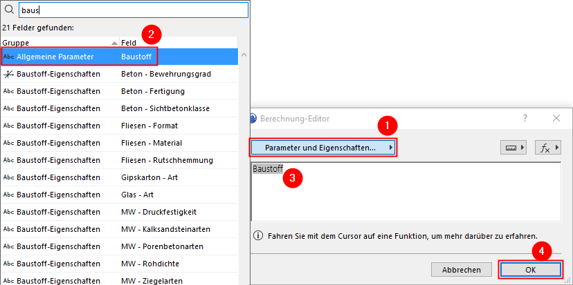 –Klicken Sie auf Parameter & Eigenschaften, um den Parameter “Baustoff” zu suchen.