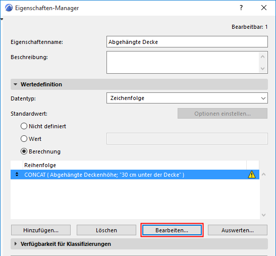Fügen Sie zum Eigenschaften-Wert “Höhe der abgehängten Decke” (in Beispiel 2: Ändern der Elementparameter mit einem Operator erstellt) einen Text-String hinzu, der diese Eigenschaft erläutert, wo immer sie angezeigt wird (z. B. in einem Raumstempel).