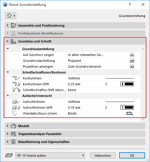 Schnittschraffuren und Konturen (Element-Einstellungen)