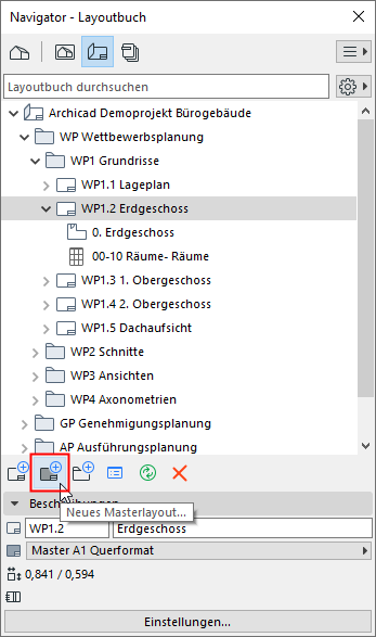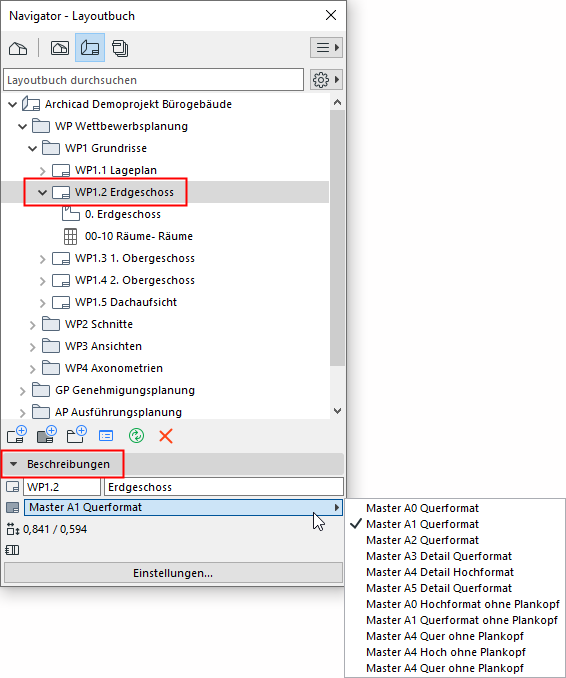 Archicad enthält mehrere vordefinierte Masterlayouts. Sie können eines dieser vordefinierten Masterlayouts verwenden oder ein eigenes Masterlayout definieren.