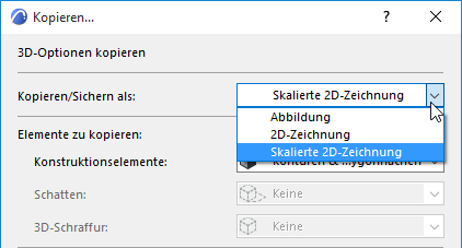 Mit den Popup-Menüs Elemente zu kopieren können Sie definieren, welche Elemente der 3D-Ansicht Sie in die Zwischenablage kopieren wollen.