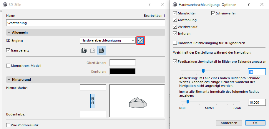 Dieses Dialogfenster steht über die Schaltfläche "OpenGL Optionen" in den 3D-Stilen zur Verfügung, wenn Sie Hardware-Beschleunigung als Ihre 3D-Engine ausgewählt haben.