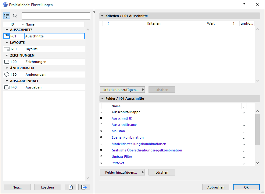 Die rechte Seite zeigt die Kriterien und Felder des ausgewählten Inhalts.